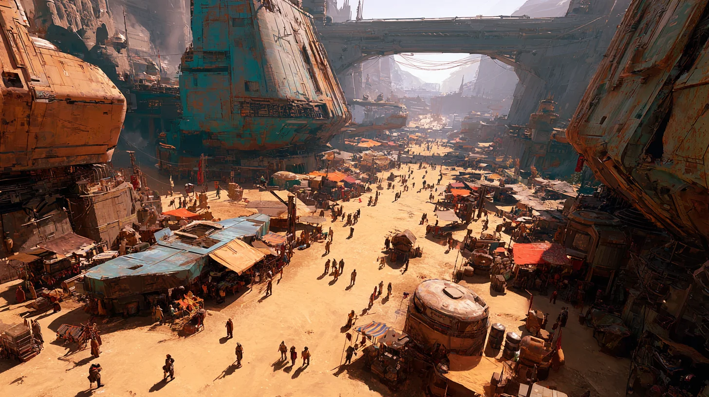 A frontier town and the "real" capital of Gliese 667. It's built into the walls of a massive, windswept canyon system for protection. It's a chaotic, vibrant shanty town of salvaged ship parts, prefab-huts, and open-air markets.